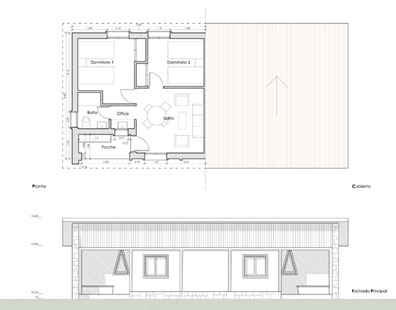 Edificio de dos plantas en la que la superior se retrasa para formar una terraza alargada. Existe cierta desproporción entre ambas plantas, siendo la superior más ancha y alta que la inferior. En el centro se marca la división de las viviendas y las terrazas mediante un gran machón de piedra de dos tramos. Los accesos se efectúan por los laterales, dejando la fachada principal un ventanal corrido para la salita y el office. La planta baja se completa con el baño. En la parte superior se encuentran las habitaciones y la terraza a la que se accede desde el distribuidor.
